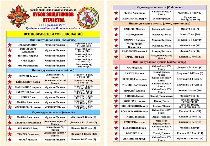 После обработки поступивших заявок выяснилось, что для участия в соревнованиях заявлено 309 спортсменов из 27 организаций шести регионов Беларуси. Впервые первенство будет разыгрываться в 40 разделах программы на трех татами. За командные призы - Кубки защитников Отечества поспорят представители рекордных 12 организаций Гродненской области. От нашего клуба выступало 27 спортсменов.