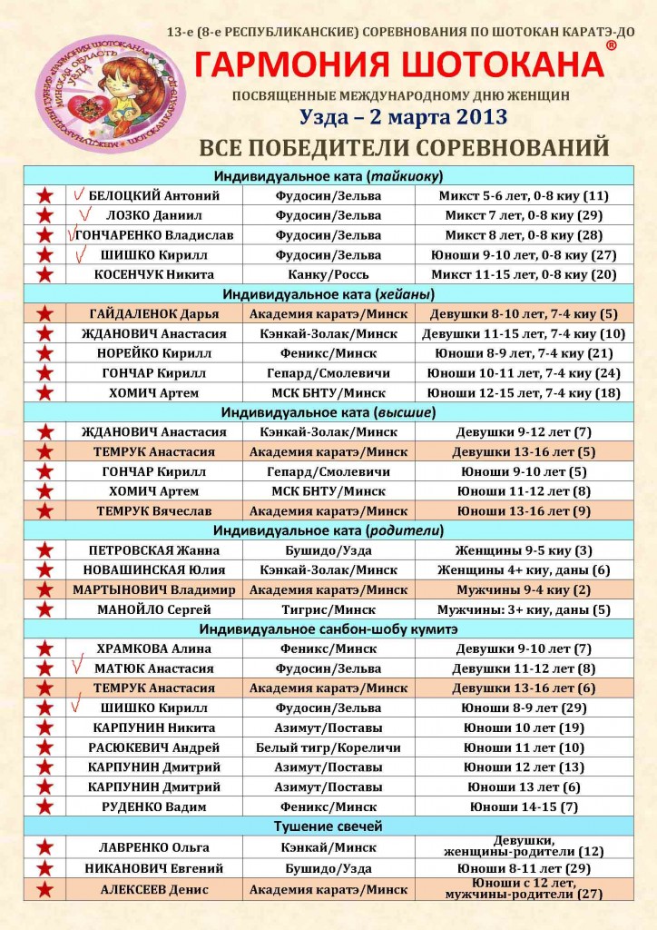 И нынешние соревнования вновь собрали более двух сотен спортсменов из 20 организаций. Первенство впервые было разыграно в 31 разделе соревновательной программы. Для всех участников организаторы подготовили памятные сувениры и призы. Интересно, что в число победителей пробились представители 12 клубов, представляющих 7 населенных пунктов разных регионов Беларуси: Минск, Зельву, Кореличи, Поставы, Россь, Смолевичи и Узду. А всего лауреатами республиканских и международных соревнований Гармония шотокана в 2005-2013 годах становились 123 спортсмена, в их числе и наш спортсмен Кирилл Шишко- 4 золотые медали.