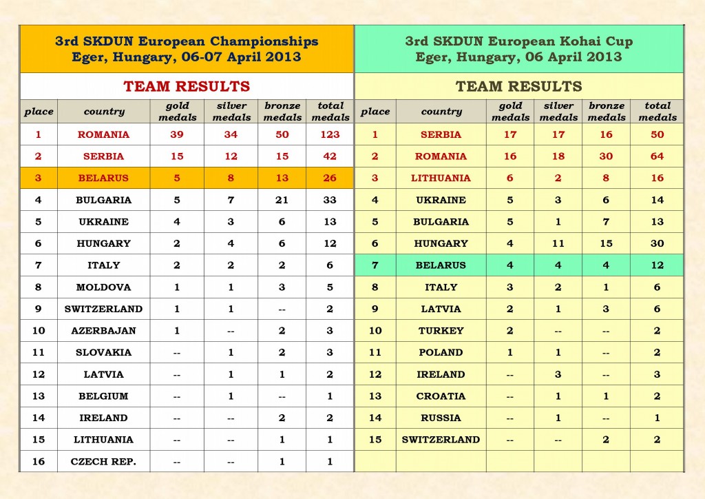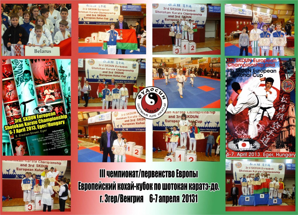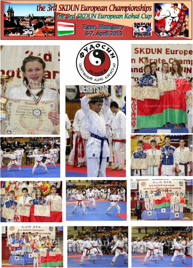 В завершившихся в в старинном венгерском городе Эгере комплексных соревнованиях Международной федерации «Шотокан каратэ-до Объединенных Наций» (SKDUN) приняли участие около 1000 спортсменов из 27 стран. В рамках турнира в третий раз прошли чемпионат/первенство Европы и международные соревнования для начинающих спортсменов - Европейский кохай-кубок по шотокан каратэ-до. Выступавшая в неполном составе сборная команда Республики Беларусь (не всем членам делегации были открыты въездные визы), сумела завоевать 26 медалей: 5 золотых, 7 серебряных и 14 бронзовых на чемпионате и первенстве Европы и 12 медалей (по четыре каждого достоинства) кохай-кубка. Чемпионами Европы-2013 по шотокан каратэ-до SKDUN стали: Павел Жуков (дважды) и Светлана Вилькина, победителями первенства Европы-2013: Мария Алексеева, Екатерина Бренько, Андрей Жилич , Анастасия Матюк и Анастасия Темрук (Академиякаратэ/Минск), победителями Европейского кохай-кубка-2013: Даниил Власов, Кирилл Норейко (Феникс/Минск), Егор Трубач и Данила Шмуляй.(Сайва/Пинск). Наши представители сборной РБ добились уникального показателя результативности выступлений: 31 из 32 выступавших в Эгере спортсменов возвращаются домой с медалями, что арифметически составляет 96, 9% состава сборной. Пять медалей (в 6 разделах) на счету Ольги Вилькиной, четыре — у Вячеслава Темрука, еще 10 белорусских спортсменов трижды поднимались на пьедестал почета. Итог командного выступления - третье место в общем зачете чемпионата/первенства Европы-2013 после выступавших в полном составе сборных Румынии и Сербии. Награждение руководителей команд-победительниц красивыми кубками состоялось после завершения соревнований, когда белорусские спортсмены уже находились в автобусе. Было очень приятно, когда все остававшиеся на спортивной арене участники проскандировали хором не только «Ro-ma-ni-ya», «Ser-bi-ya» и «Bul-ga-ri-ya» (четвертое место), но также близкое нам «Be-la-rus»!