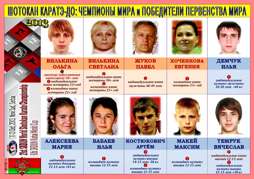 Бабич-Островский Павел (Сайва-ПолесГУ/Пинск), Вилькина Светлана, Вилькина Ольга (Академия каратэ/Минск), Гаврильчик Андрей (Бассай/Волковыск), Дудко Дмитрий (Канку/Россь), Катвицкая Татьяна (Гепард/Смолевичи), Ламеко Владимир (Фудосин/Зельва), Пашкевич Владимир (БФВЕ/Борисов), Слюсарь Александр (Ягуар/Минск), Чебуркина Виктория, Щербакова Елена (МСК БНТУ/Минск).