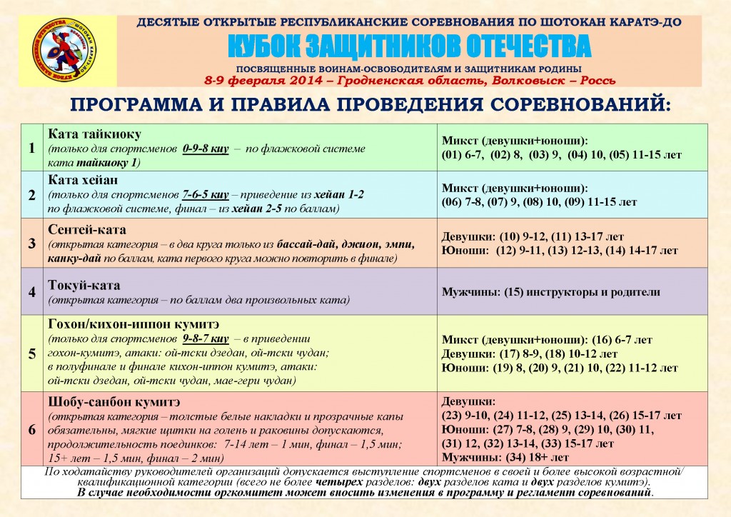 В нынешнем году соревнования включают 34 раздела программы для участников 6-17 лет, взрослых (в кумитэ), а также инструкторов и родителей (в ката). По итогам соревнований будет сформирован состав сборной команды для участия в Клубном чемпионате стран Балтии по шотокан каратэ-до, который пройдет 22-24 февраля на татами знаменитой CIDO Sport Arena в литовском Паневежисе.