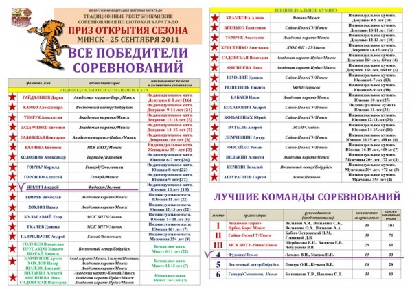 Отлично выступили: Мосько Роман, Макей Максим, Жилич Андрей (победитель РБ), Матюк Анастасия командном и инд.ката., Горчичко Иван занял 5 место в индивидуальном кумитэ.