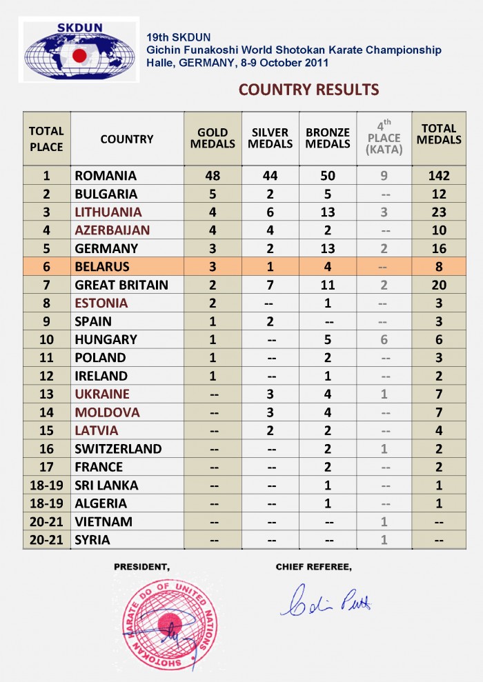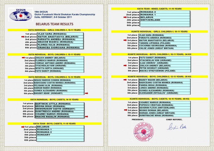 Честь нашей страны было доверено защищать четырем спортсменам клуба Фудосин (Зельва), каждый из которых завоевал по три личных медали первенства в возрастной группе 11-15 лет: Анастасия Матюк (2,3,3 места), Андрей Жилич (1,1,3), Максим Макей(1,1,3) и Роман Мосько (1,3,3).