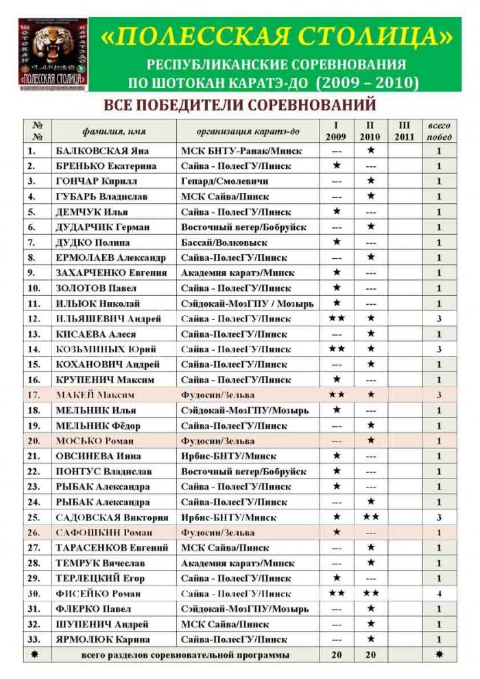 Двадцатый юбилейный Национальный чемпионат Республики Беларусь по шотокан каратэ-до и Республиканские соревнования Полесская столица 26-27 ноября принимает древний Пинск, город, который в Беларуси по праву называют столицей Полесья. Совместное проведение двух этих интересных соревнований объясняется совпадением двух праздничных дат: двадцатилетиями Белорусской федерации шотокан каратэ-до и одной из ее ведущих организаций – Пинского молодежно-спортивного клуба Сайва.