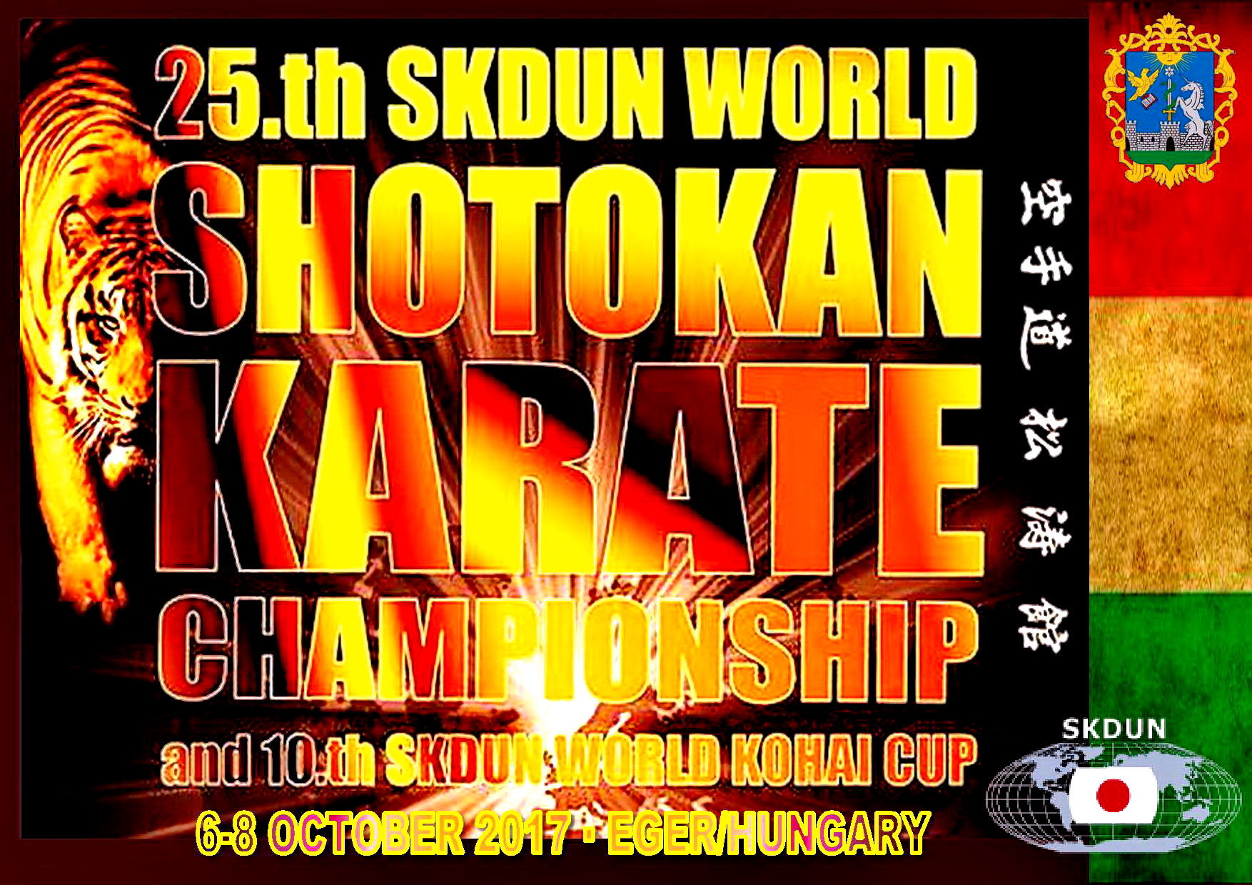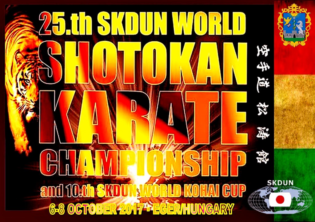 Юбилейные 25-й чемпионат/первенство мира Гичина Фунакоши и 10-й Всемирный кохай-кубок по шотокан каратэ-до SKDUN (Всемирной федерации шотокан каратэ-до Объединенных Наций) состоятся в венгерском городе Эгер. Здесь расположен главный офис и секретариат SKDUN, в последние годы несколько раз проводились мировое (2009) и европейские чемпионаты (2014, 2013, 2011) по шотокан каратэ-до. В категориях чемпионата/первенства мира примут участие сильнейшие спортсмены с квалификацией коричневых и черных поясов (3-1 киу и даны). В разделах всемирного кохай-кубка выступят начинающие спортсмены белых, желтых и оранжевых поясов (9-7 киу) и отдельно обладатели зеленых и синих поясов (6-4 киу).