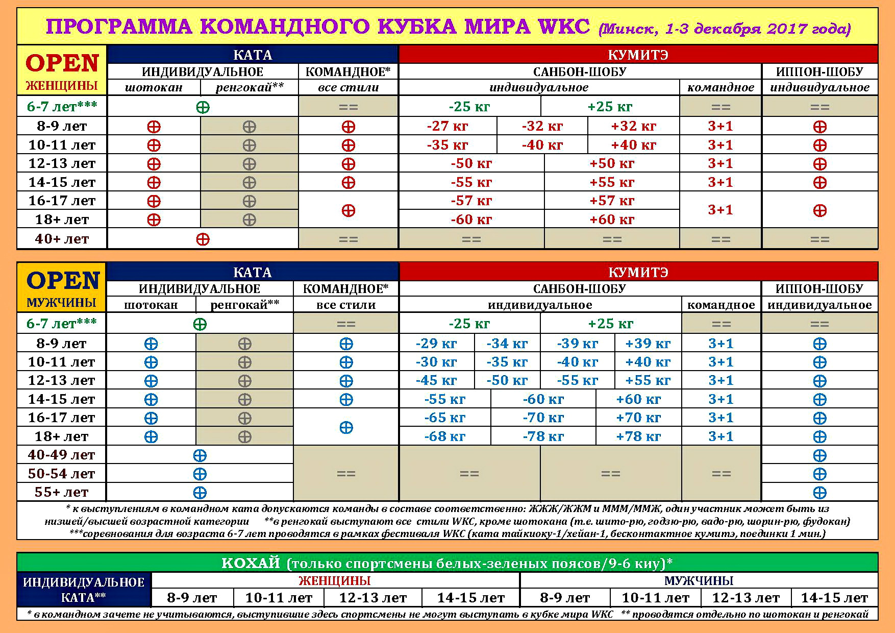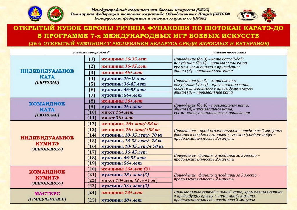 Предполагается одновременное проведение в Минске соревнований всемирного и европейского ранга по 15 видам боевых искусств. Направления каратэ в составе IMAG-2017 представят два отдельных турнира: командный кубок мира Всемирной конфедерации каратэ (WKC) и кубок Европы Гичина Фунакоши Всемирной федерации шотокан каратэ-до Объединенных Наций (SKDUN). Их обширная программа позволит принять участие в этих соревнованиях широкому кругу занимающихся каратэ. Подобные мероприятия в нашей стране ранее не проводились. Принято окончательное решение по месту проведения соревнований по каратэ — главная арена Дворца игровых видов спорта Уручье (Минск, пр. Независимости, 196).