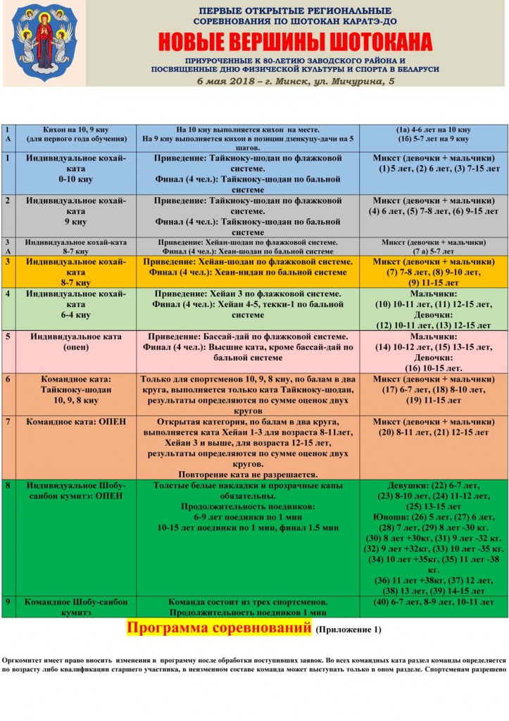 Юношеские межрегиональные соревнования Новые вершины шотокана-2018 организованы клубом Айсберг (руководители: Юлия Новашинская и Наталья Савченко) Белорусской федерации шотокан каратэ-до по предложению Дворца детей и молодежи Золак Заводского района Минска. Они состоятся в программе мероприятий, приуроченных к 80-летию района и Дню физической культуры и спорта в Беларуси. Соревнования проводятся в один день на трех площадках учебного филиала ДДМ Золак по адресу: Минск, ул. Мичурина, 5(район станции метро Автозаводская).
