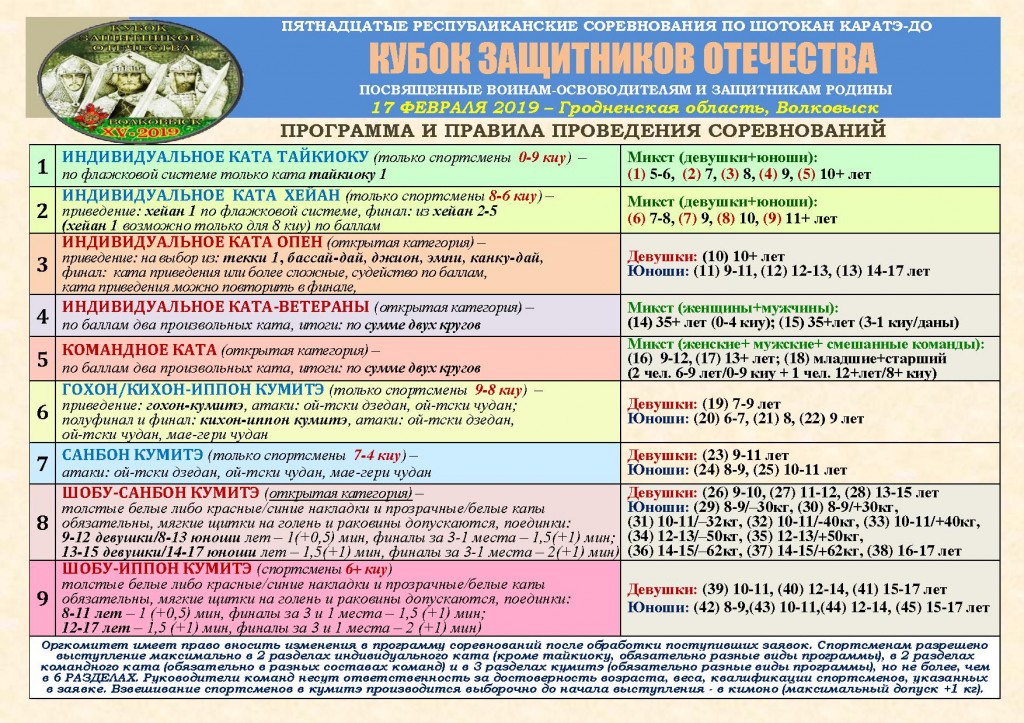Программа соревнований-2019, приуроченных к 75-летию освобождения Беларуси от немецко-фашистских захватчиков, включает 45 разделов в четырех видах индивидуального ката (тайкиоку, хейан, опен и среди ветеранов), командном ката, четырех видах обусловленного и свободного кумитэ (гохон/кихон-иппон, санбон, шобу-санбон и шобу-иппон). Борьба за награды пройдет в один день на трех татами. Спортсменам разрешено выступление максимально в 2 разделах индивидуального ката (кроме тайкиоку, обязательно разные виды программы), в 2 разделах командного ката (обязательно в разных составах команд) и в 3 разделах кумитэ (в 2 или 3 видах программы), но не более, чем в 6 разделах.