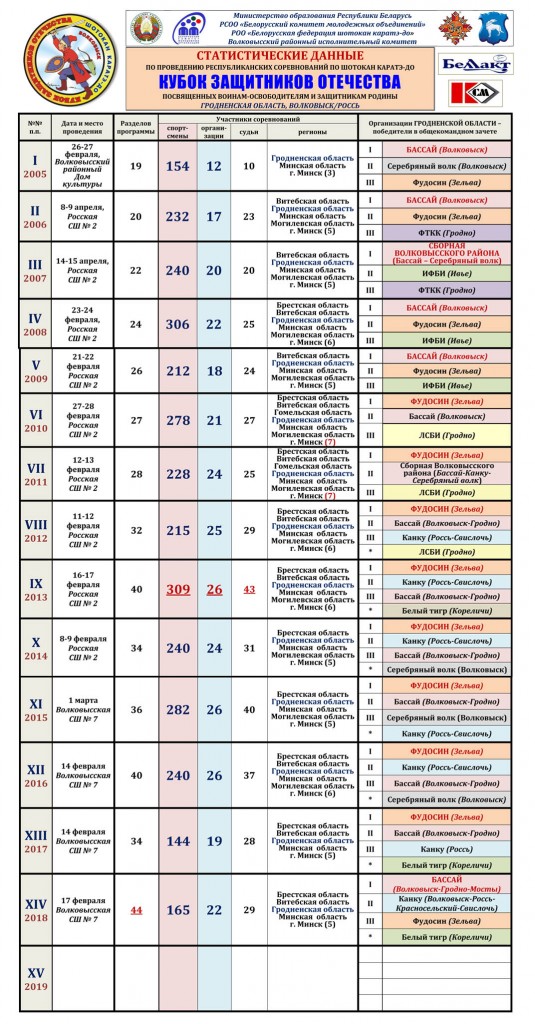 Впервые республиканские соревнования Белорусской федерации шотокан каратэ-до Кубок защитников Отечества состоялись в Волковыском районе Гродненской области в 2005 году. С тех пор они проводятся ежегодно и стали узнаваемым спортивным брендом региона. Нынешний турнир — юбилейный, он проводился уже в пятнадцатый раз (смотрите статьи нашего сайта: 2018, 2017, 2016, 2015, 2014, 2013, 2012, 2011). Инициатором и главным организатором соревнований выступает молодежный спортивный клуб Бассай/Волковыск (руководитель А.Н.Гаврильчик). Надежными партнерами Белорусской федерации шотокан каратэ-до по осуществлению этого социально значимого проекта являются Волковысский районный исполнительный комитет (председатель М.М.Ситько), предприятия и учреждения района и Гродненской области.