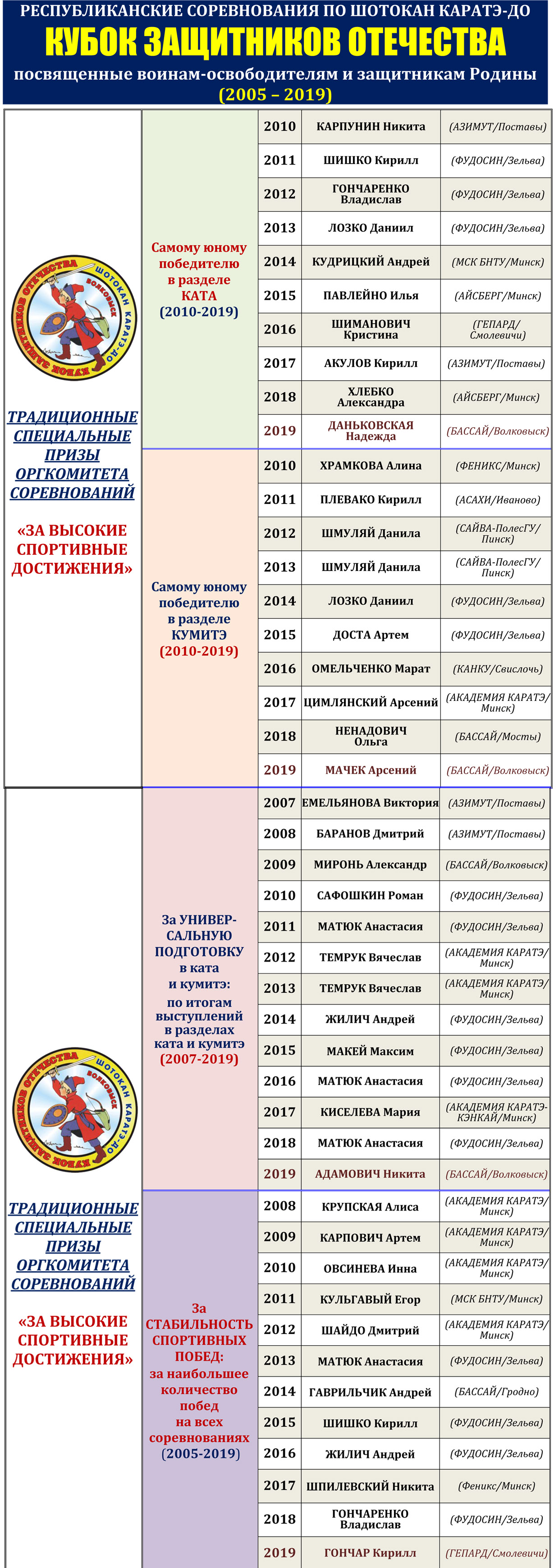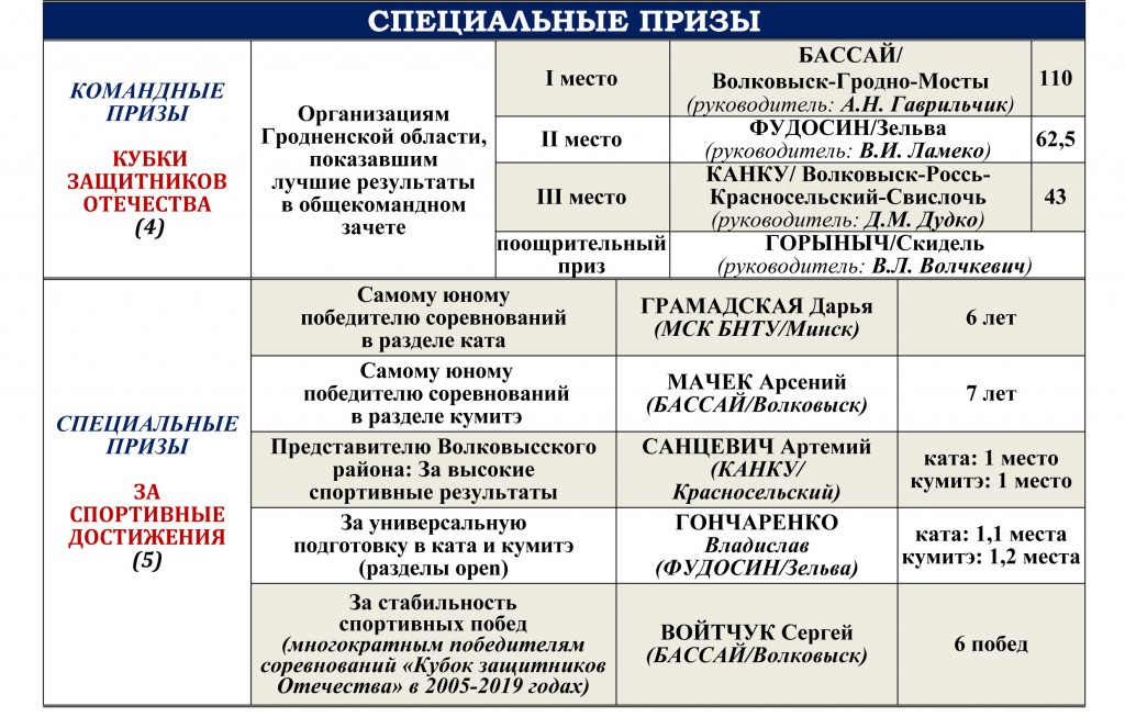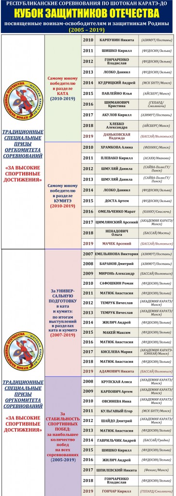 После небольшого перерыва участников, официальных лиц и гостей соревнований снова примет спортивный комплекс средней школы №2 г.п. Россь (адрес: ул. Солнечная 4а). Накануне выступлений впервые состоится региональный судейский семинар по шотокан каратэ-до. Борьба за награды пройдет в один день на трех татами, уложенных в большом спортивном зале комплекса. Кроме командных кубков для коллективов Гродненской области будут разыграны специальные призы в пяти традиционных номинациях. По итогам участия во всех 15 проведенных волковыских турнирах их лауреатами являются уже 258 спортсменов. Наибольшее количество побед на волковыских стартах 2005-2019 годов одержали: А.Матюк (15), А.Гаврильчик (10), В.Гончаренко и К.Шишко (по 8), А.Миронь, И.Павлейно и Н.Шпилевский (по 7).