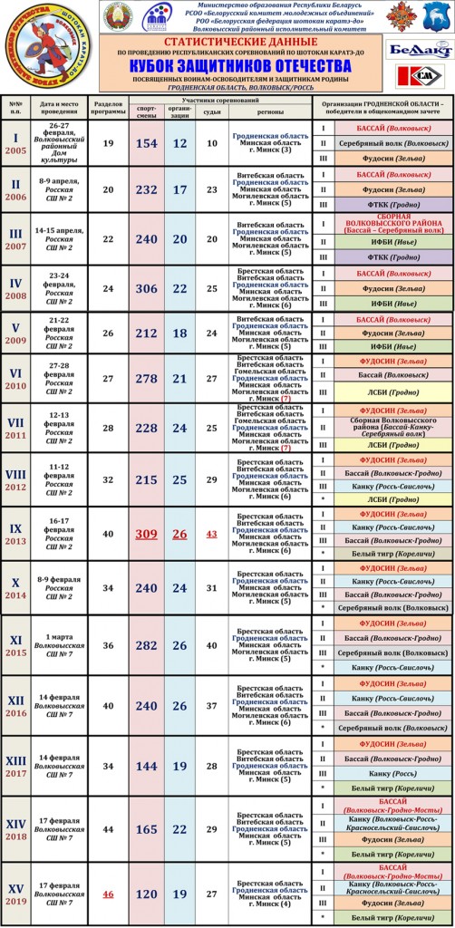 Соревнования Белорусской федерации шотокан каратэ-до Кубок защитников Отечества проводятся в Волковыском районе Гродненской области с 2005 года. За полтора десятка лет их организации они стали известнейшим спортивным брендом региона (смотрите статьи нашего сайта: 2019, 2018, 2017, 2016, 2015, 2014, 2013, 2012, 2011). Инициатором и главным организатором соревнований неизменно выступает молодежный спортивный клуб Бассай/Волковыск. Его руководитель Андрей Гаврильчик накануне отметил свой 45-летний юбилей. Постоянными партнерами Белорусской федерации шотокан каратэ-до по осуществлению этого социально значимого проекта являются Волковысский районный исполнительный комитет (председатель — член Совета Республики Национального Собрания Республики Беларусь Михаил Ситько), предприятия и учреждения района и Гродненской области.
