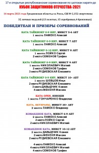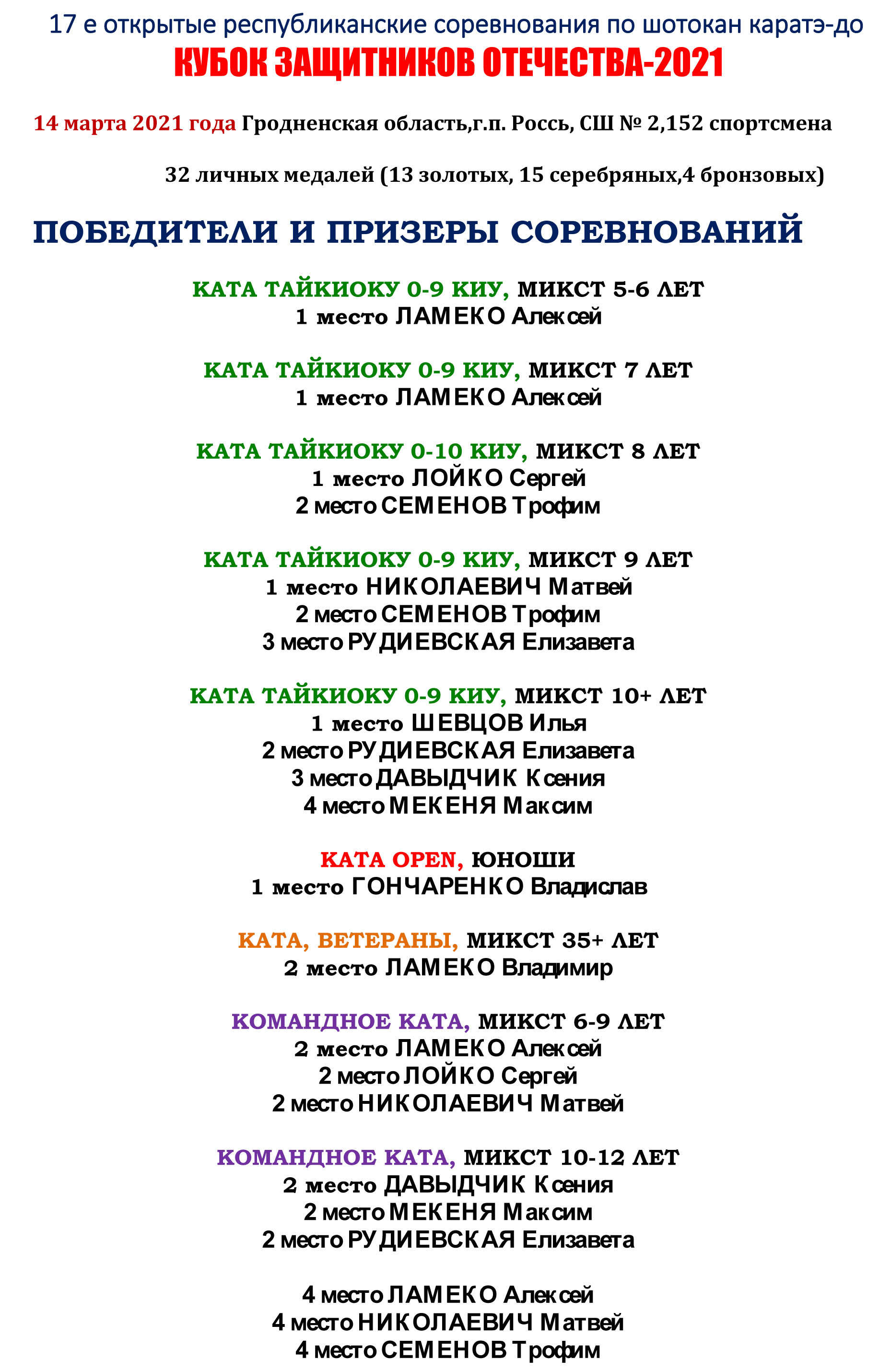 Программа очередного, 17-го по счету турнира включает 40 разделов в четырех видах индивидуального ката (тайкиоку, хейан, опен и среди ветеранов), командном ката, трех видах обусловленного и свободного кумитэ (гохон/кихон-иппон, санбон и шобу-санбон). Общекомандное первенство впервые в нашей практике будет разыграно в двух номинациях: среди всех организаций и отдельно среди коллективов Гродненской области. По каждой номинации будут вручены по четыре командных приза — Кубка защитников Отечества-2021. Соревнования станут первым этапом формирования сборной команды Республики Беларусь для предполагаемого выступления нашей команды на чемпионате/ первенстве Европы SKDUN-2021 по шотокан каратэ-до 18-20 июня в Ново Место/Словения.