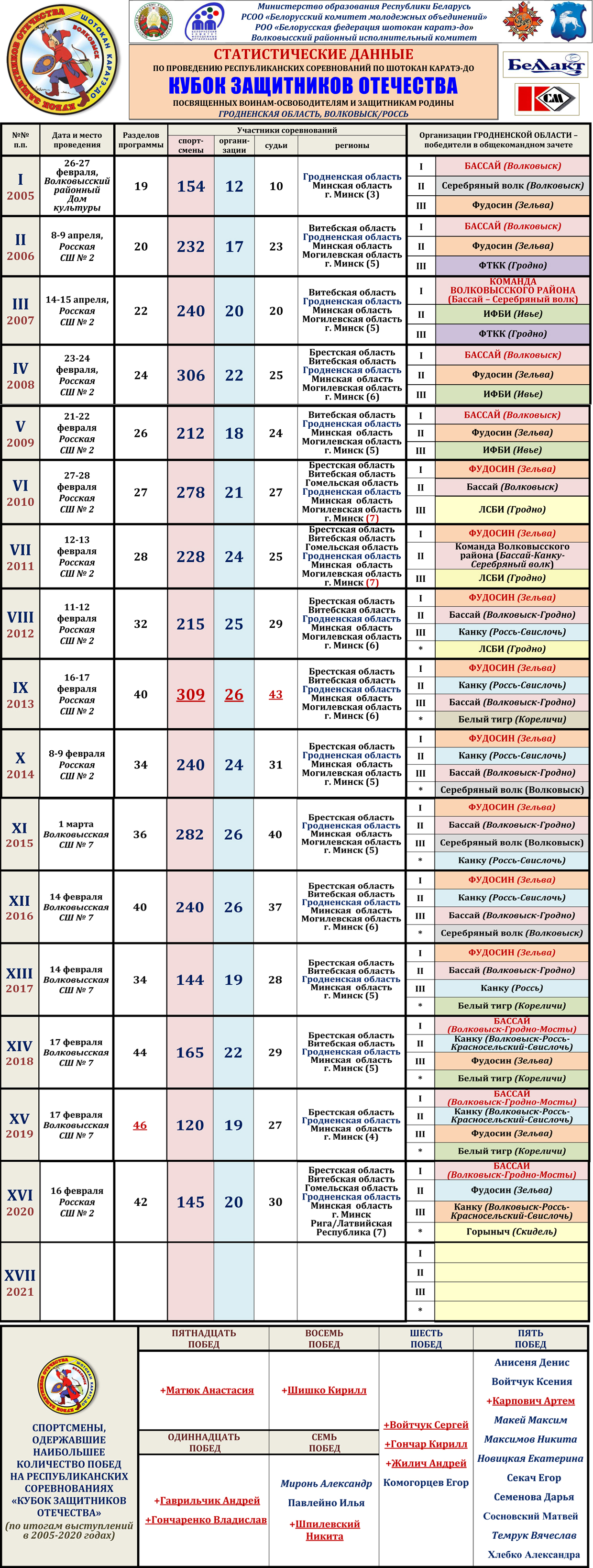 Впервые соревнования Белорусской федерации шотокан каратэ-до Кубок защитников Отечества были организованы в Волковыском районе Гродненской области в 2005 году. За непрерывных 16 лет их проведения они стали популярным спортивным брендом региона (смотрите статьи нашего сайта: 2020, 2019, 2018, 2017, 2016, 2015, 2014, 2013, 2012, 2011). Инициатором и основным организатором соревнований выступает молодежный спортивный клуб Бассай/Волковыск (руководитель — Андрей Гаврильчик). Постоянными партнерами Белорусской федерации шотокан каратэ-до по осуществлению этого социально значимого проекта являются Волковысский районный исполнительный комитет (председатель — член Совета Республики Национального Собрания Республики Беларусь Михаил Ситько), предприятия и учреждения района и Гродненской области.